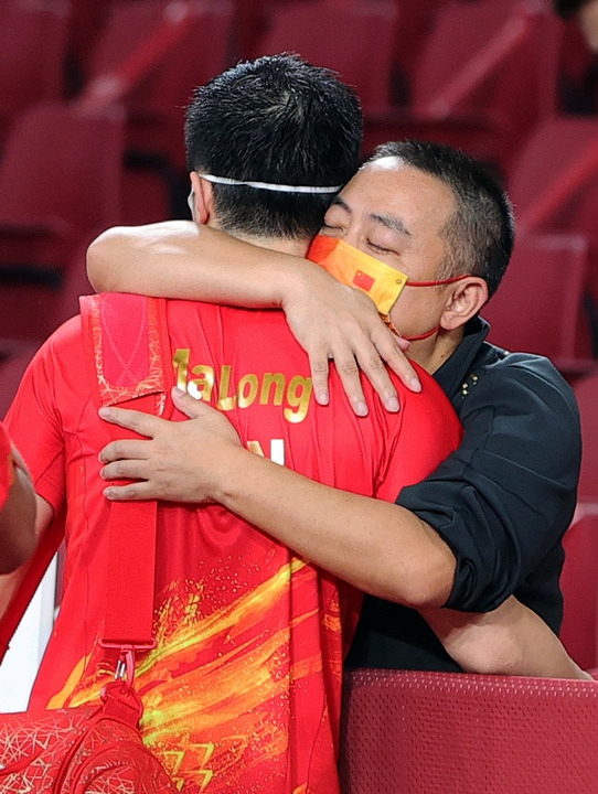 7月29日,劉國梁(右)和馬龍慶祝勝利。當(dāng)日,在東京奧運(yùn)會(huì)乒乓球項(xiàng)目男子單打半決賽中,中國選手馬龍以4比3戰(zhàn)勝德國選手奧恰洛夫,晉級(jí)決賽。新華社記者 王東震 攝