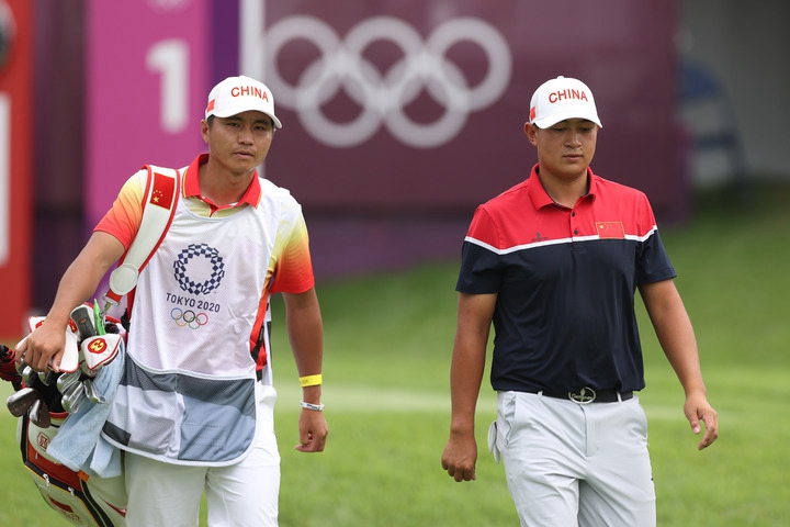 7月29日,中國選手袁也淳(右)在比賽中。當(dāng)天,東京奧運(yùn)會(huì)高爾夫項(xiàng)目男子個(gè)人比桿賽在日本埼玉縣霞關(guān)鄉(xiāng)村俱樂部開賽。新華社記者 鄭煥松 攝