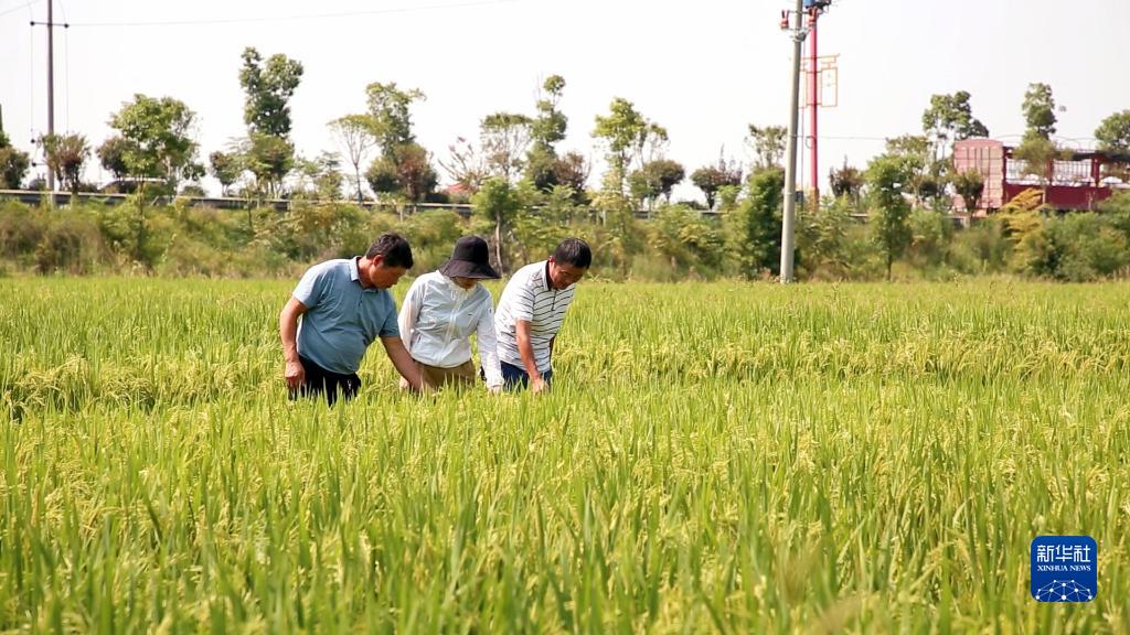 9月17日,在湖南省汨羅市汨羅鎮(zhèn)江景村的稻田里,種糧大戶曾岳華(左)與兩位農(nóng)業(yè)技術(shù)人員查看優(yōu)質(zhì)稻“泰優(yōu)390”結(jié)實(shí)率。新華社發(fā)(胡清 攝)