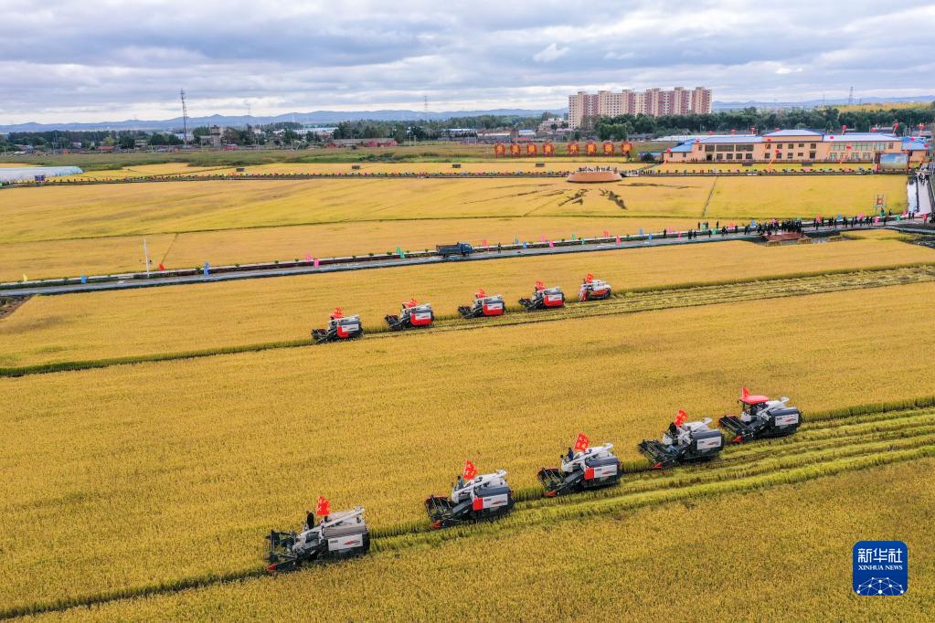 在吉林省長春市九臺區(qū)龍嘉街道紅光村,農(nóng)民駕駛農(nóng)機進行水稻收割作業(yè)(9月23日攝,無人機照片)。新華社記者 張楠 攝