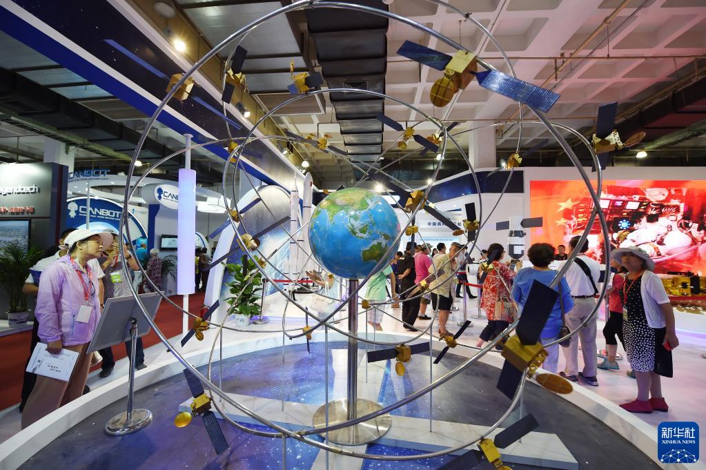 參觀者在第二十屆中國北京國際科技產(chǎn)業(yè)博覽會上參觀展出的北斗衛(wèi)星導航系統(tǒng)模型(2017年6月9日攝)。新華社記者 鞠煥宗 攝