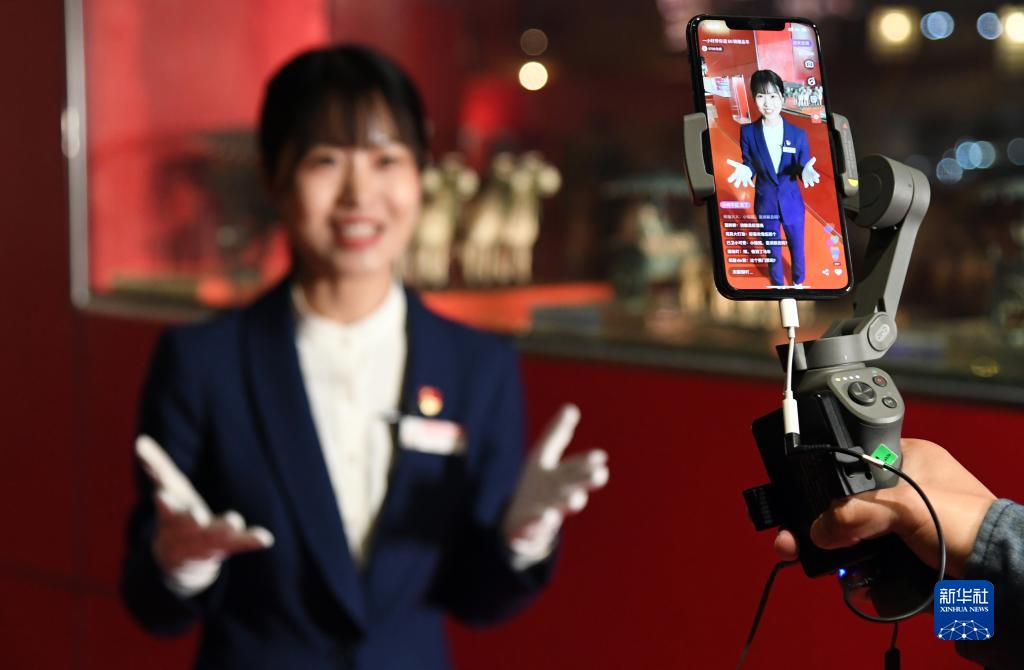 2020年4月30日,在北京汽車博物館,講解員曾紅娟通過網(wǎng)絡直播平臺為觀眾介紹館內的藏品車。新華社記者 任超 攝