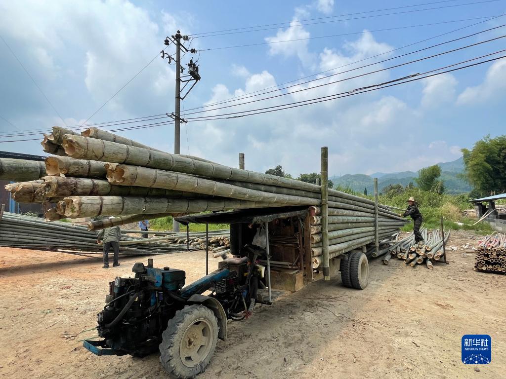 湖南省汝城縣熱水鎮(zhèn)村民在搬運竹子(8月22日攝)。新華社記者 蘇曉洲 攝