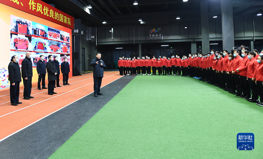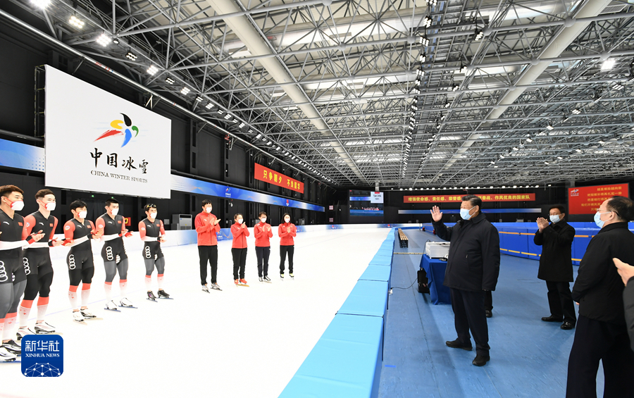 1月4日,中共中央總書記、國家主席、中央軍委主席習(xí)近平在北京考察2022年冬奧會、冬殘奧會籌辦備賽工作。這是4日下午,習(xí)近平在二七廠冰雪項(xiàng)目訓(xùn)練基地速滑館,向參訓(xùn)運(yùn)動(dòng)員、教練員表示慰問。新華社記者 謝環(huán)馳 攝