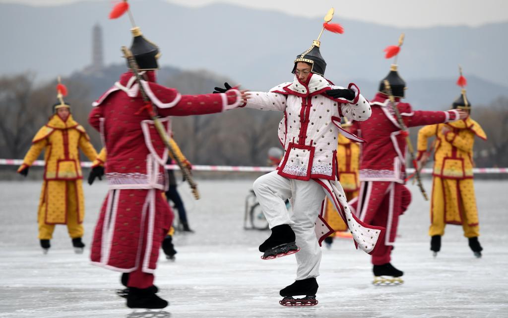 在北京頤和園冰場舉辦的還原清朝八旗官兵冰嬉活動(dòng)的表演(2018年1月21日攝)。新華社記者 李俊東 攝
