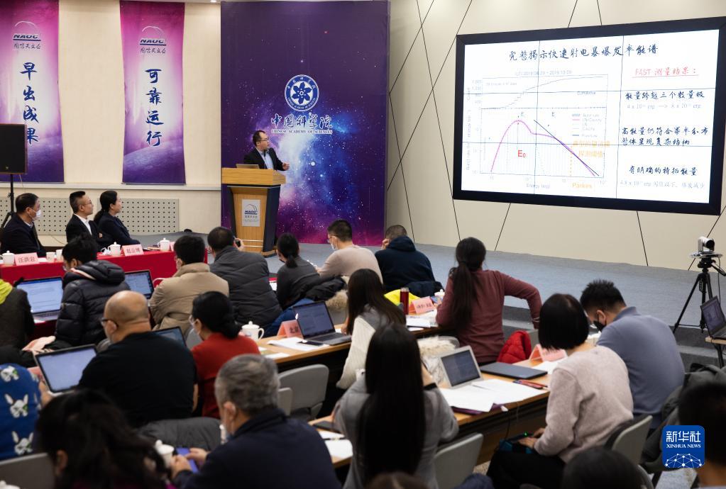 1月5日,在中科院國(guó)家天文臺(tái)舉行的新聞發(fā)布會(huì)上,國(guó)家天文臺(tái)王培在介紹FAST在快速射電暴領(lǐng)域的重大成果。新華社記者 金立旺 攝