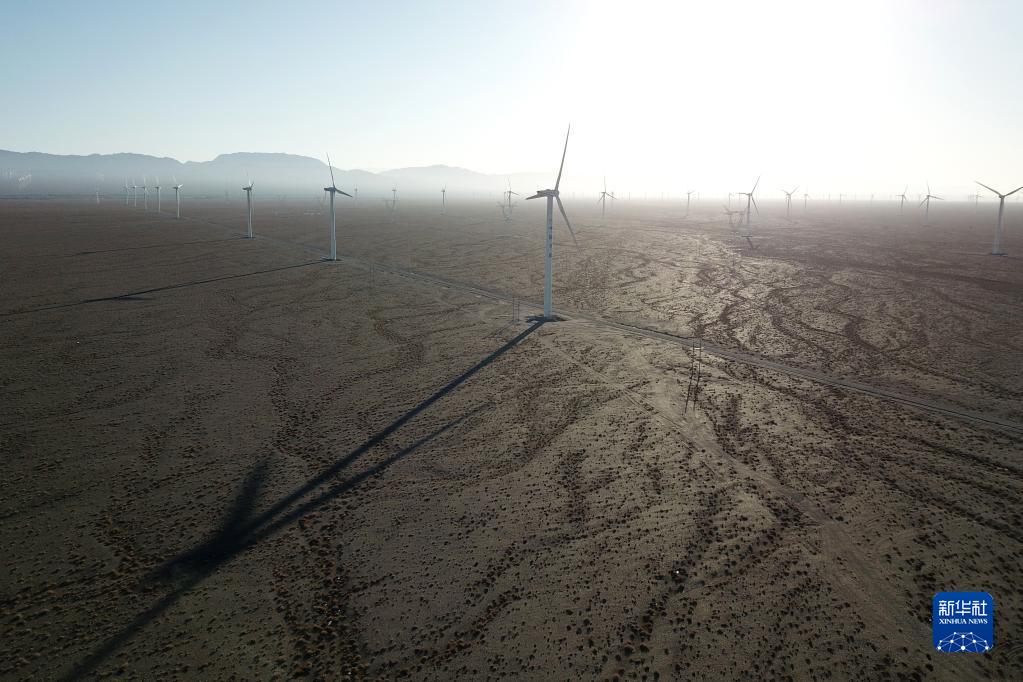 這是2021年12月8日拍攝的中節(jié)能(甘肅)風(fēng)力發(fā)電有限公司玉門昌馬風(fēng)電場(chǎng)的風(fēng)機(jī)(無(wú)人機(jī)照片)。新華社記者 范培珅 攝