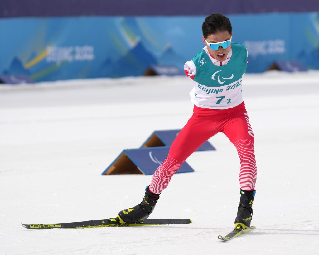 3月13日,中國(guó)隊(duì)選手王晨陽(yáng)在北京冬殘奧會(huì)殘奧越野滑雪混合接力4×2.5公里比賽中。新華社記者 萬(wàn)象 攝