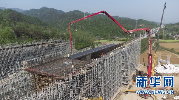 “此次一次性澆筑的混凝土約1100噸,由于澆筑過(guò)程時(shí)間長(zhǎng),技術(shù)人員須嚴(yán)格按照技術(shù)交底指導(dǎo)現(xiàn)場(chǎng)施工,認(rèn)真落實(shí)安全質(zhì)量責(zé)任制,重點(diǎn)對(duì)澆筑速度、混凝土質(zhì)量以及澆筑過(guò)程中模板變形情況進(jìn)行監(jiān)控,確保澆筑順利完成?!敝需F四局澠淅高速跨浩吉立交項(xiàng)目負(fù)責(zé)人說(shuō)。