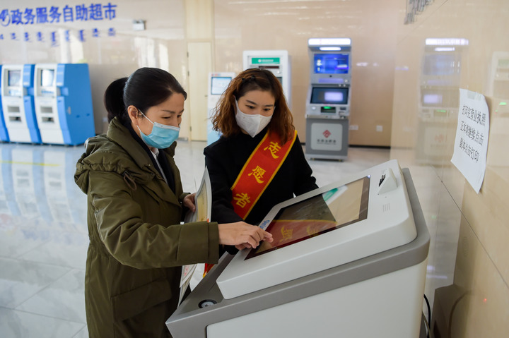 4月2日,在位于呼和浩特市玉泉區(qū)政務(wù)服務(wù)中心的“24小時(shí)政務(wù)服務(wù)自助超市”,一位市民在工作人員指導(dǎo)下打印營(yíng)業(yè)執(zhí)照。新華社記者李志鵬 攝