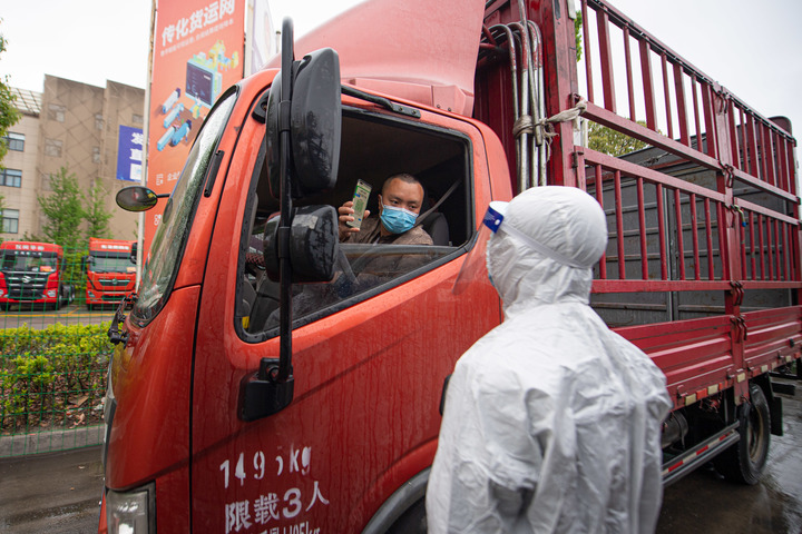 4月13日,工作人員查驗(yàn)駛?cè)牒贾輦骰犯鄣呢涇囁緳C(jī)健康碼。新華社記者江漢 攝