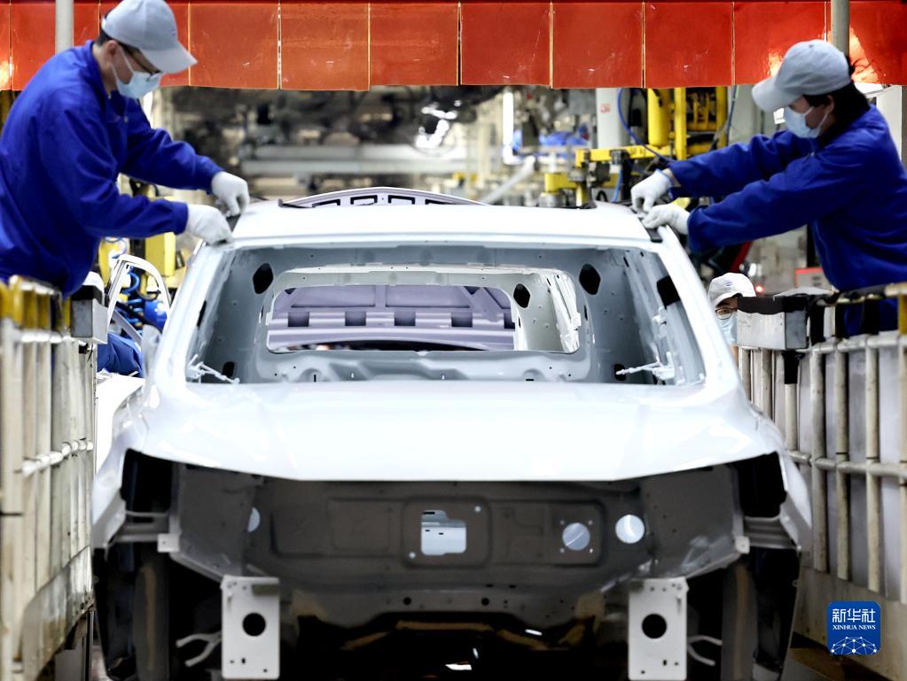 上汽臨港乘用車(chē)工廠工人在總裝車(chē)間工作(4月23日攝)。新華社記者 陳建力 攝