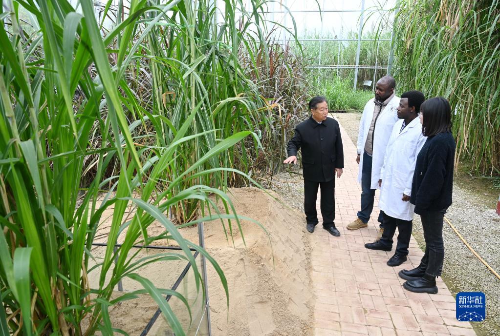 2021年11月23日,福建農(nóng)林大學(xué)菌草專家林占熺(左一)在國家菌草工程技術(shù)研究中心菌草種質(zhì)資源圃給外國留學(xué)生(左二、左三)講解菌草的種植培育技術(shù)。新華社記者 林善傳 攝