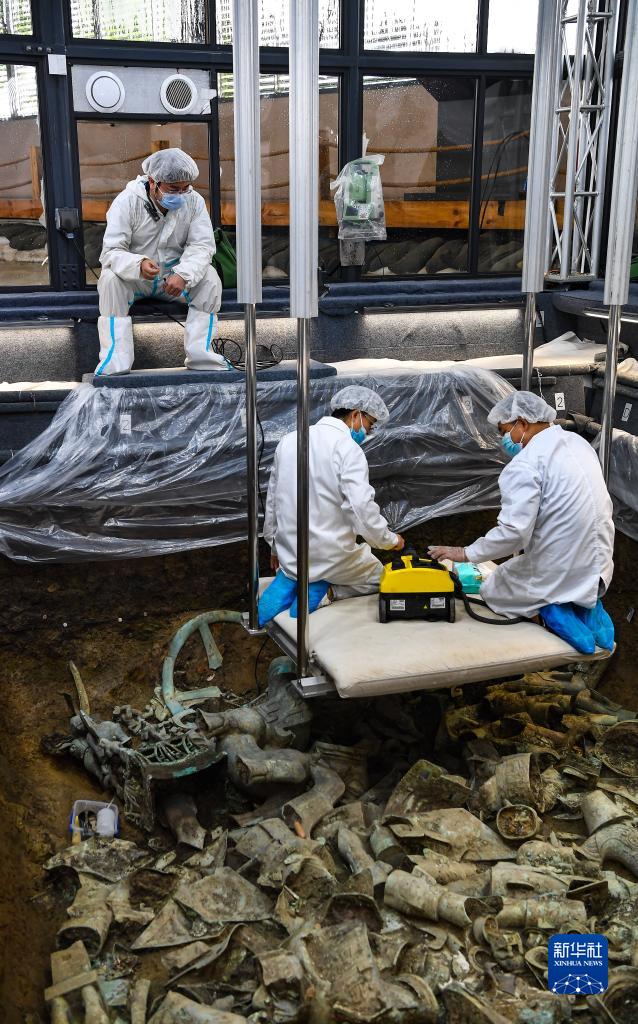 在三星堆遺址8號(hào)“祭祀坑”,8號(hào)“祭祀坑”發(fā)掘負(fù)責(zé)人、北京大學(xué)考古文博學(xué)院副教授趙昊(左)與考古工作者任俊鋒一起清理銅神壇(6月1日攝)。新華社記者 沈伯韓 攝