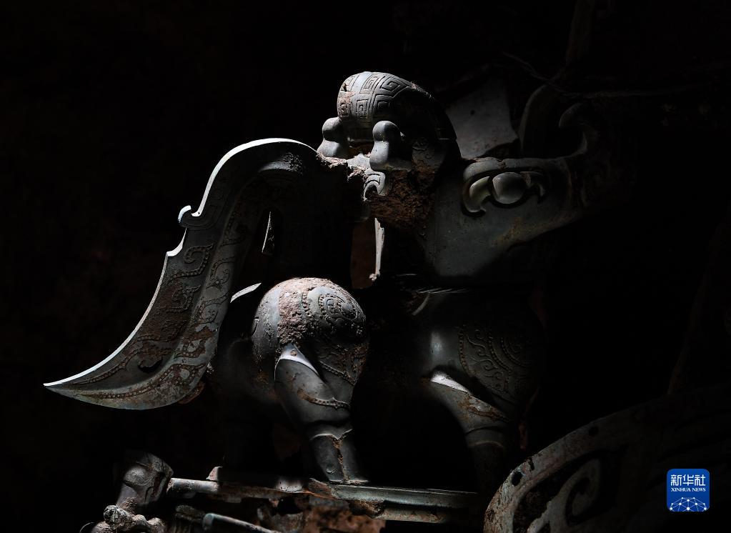 這是在三星堆遺址8號(hào)“祭祀坑”拍攝的銅神獸(6月1日攝)。新華社記者 王曦 攝