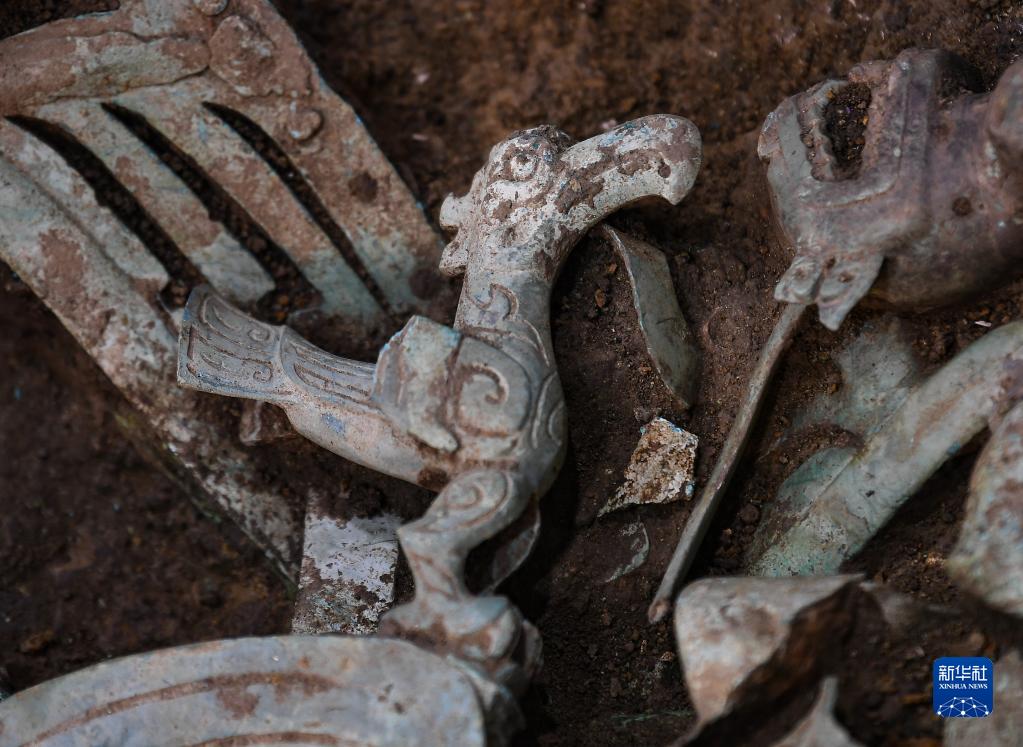 這是在三星堆遺址8號(hào)“祭祀坑”拍攝的銅神鳥(6月1日攝)。新華社記者 王曦 攝