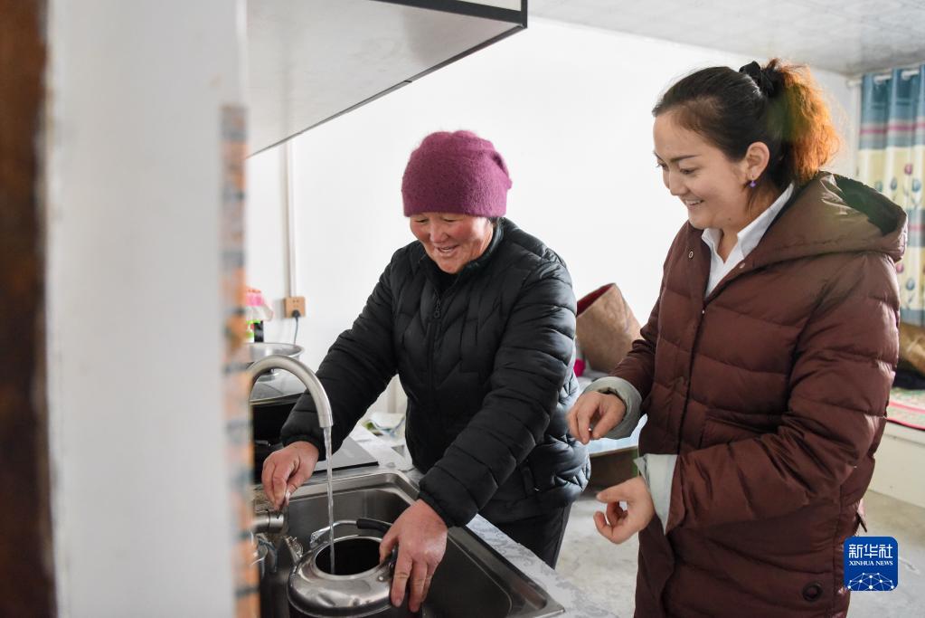 在新疆福??h解特阿熱勒鎮(zhèn)京什開薩爾村,村干部(右)來(lái)到前不久剛接通自來(lái)水的村民家中了解水質(zhì)情況(2021年11月25日攝)。新華社記者 丁磊 攝