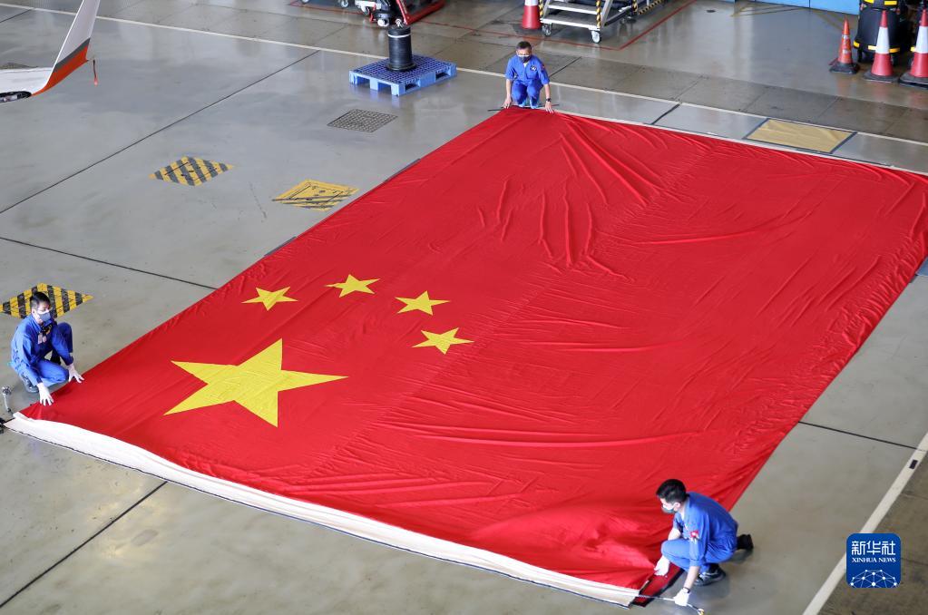 直升機務(wù)教官蔡澤民套上鞋套,戴上白手套,拿著夾有《國旗及國徽條例》的文件夾,一一對照檢查。國旗是在具備資質(zhì)的廠家專門定制的,規(guī)格規(guī)范都有嚴(yán)格要求。國旗大,就有拼接。蔡澤民主要查看色澤是否飽滿和均勻,接縫是否平整,四條邊上有沒有線頭等,特別要注意的是,五顆星星處不可有接縫。一番操作下來,后背已然濕透。