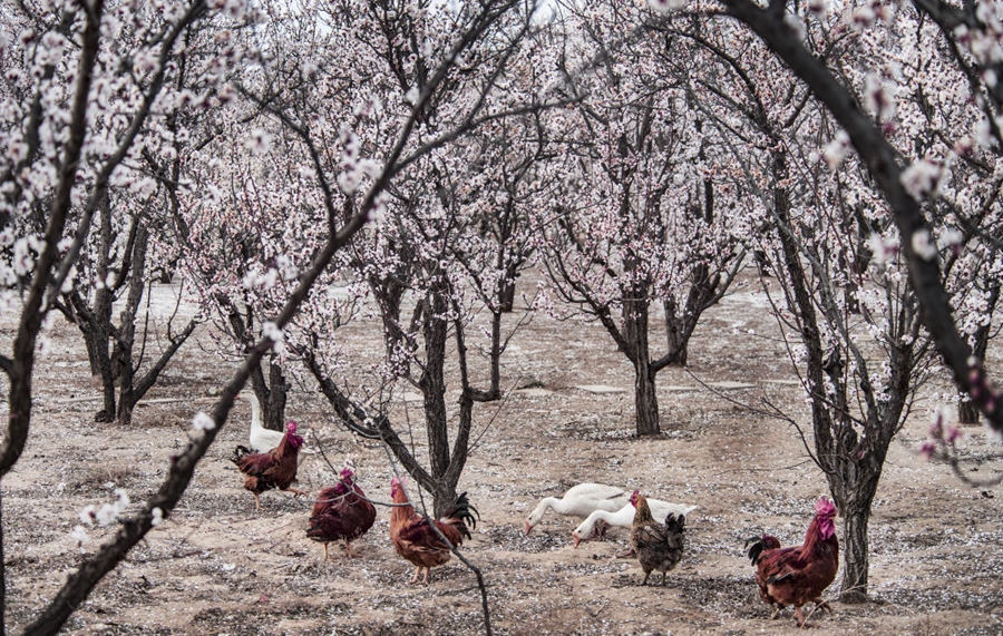 ↑一群雞鵝在陜西省榆林市榆陽(yáng)區(qū)古塔鎮(zhèn)趙家茆村的杏樹(shù)林里覓食(2020年4月7日攝)。當(dāng)?shù)厝罕娫诎l(fā)展杏產(chǎn)業(yè)的同時(shí)發(fā)展林下經(jīng)濟(jì),成效顯著。