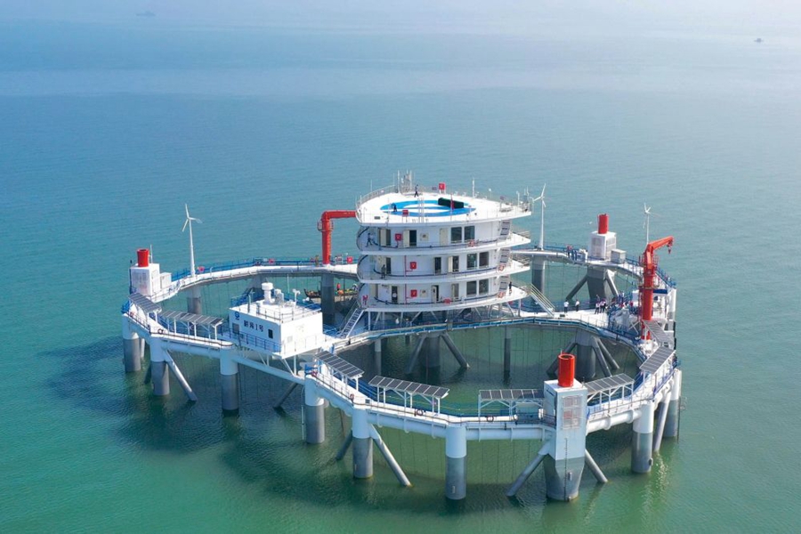↑“耕海1號(hào)”海洋牧場(chǎng)綜合體平臺(tái)位于山東省煙臺(tái)市漁人碼頭以東海域,是我國(guó)首座大型智能化海洋牧場(chǎng)綜合體平臺(tái),于2020年7月投運(yùn),每年可養(yǎng)殖優(yōu)質(zhì)海水魚(yú)類20萬(wàn)尾,年產(chǎn)量約15萬(wàn)公斤(2020年7月10日攝)。