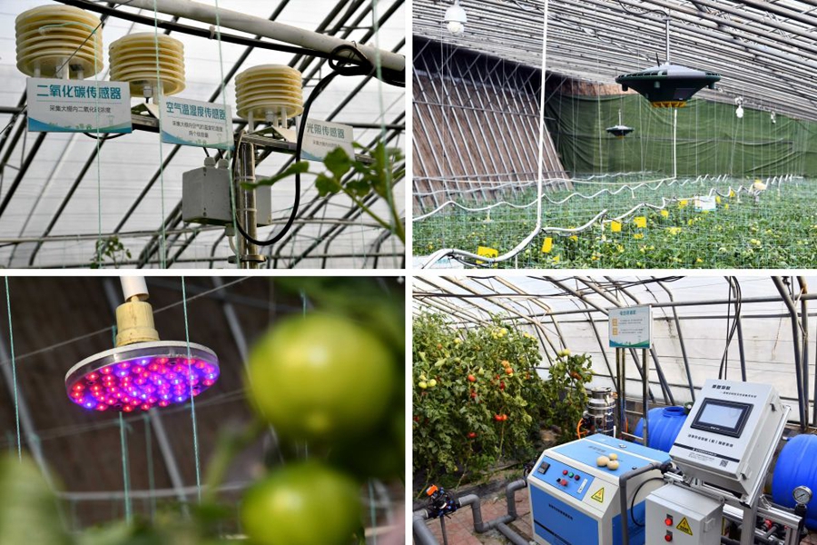 ↑這是在山東省壽光市現(xiàn)代農(nóng)業(yè)高新技術(shù)試驗(yàn)示范基地拍攝的AI智慧大棚內(nèi)景。左上為傳感器設(shè)備;右上為多功能植保機(jī);左下為補(bǔ)光燈;右下為電動(dòng)噴淋機(jī)(2020年4月21日攝)。