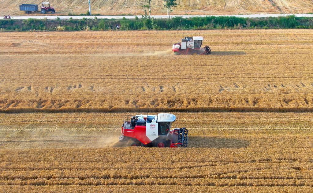 2022年6月8日,在河南省安陽市湯陰縣菜園鎮(zhèn)高標(biāo)準農(nóng)田示范區(qū),收割機在麥田作業(yè)(無人機照片)。新華社記者郝源攝