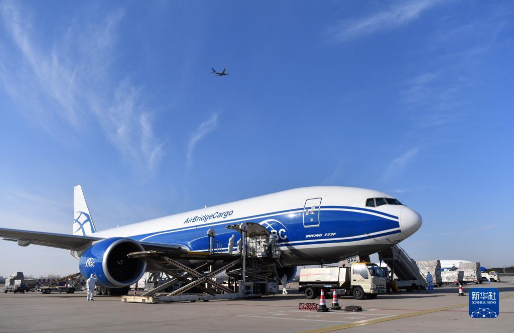 鄭州新鄭國(guó)際機(jī)場(chǎng)工作人員在為一架俄羅斯空橋貨運(yùn)航空公司貨機(jī)裝貨(2021年12月30日)。新華社記者 李嘉南 攝