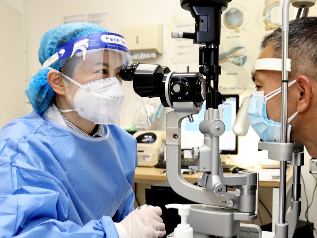 資料圖:上海市第十人民醫(yī)院眼科主任醫(yī)師鄒?。ㄗ螅榛颊邫z查。新華社記者 陳建力 攝