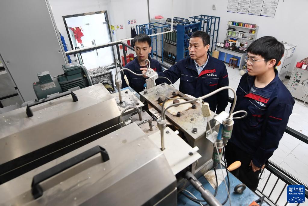 福建閩江學(xué)院服裝與藝術(shù)工程學(xué)院教授李永貴(中)在“福建省新型功能性紡織纖維及材料重點(diǎn)實(shí)驗(yàn)室”教學(xué)生做紡絲實(shí)驗(yàn)(2021年3月22日攝)。新華社記者 林善傳 攝