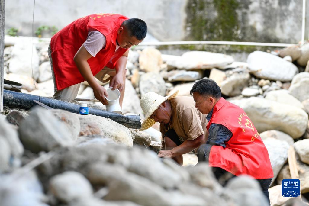 在貴州省黔東南苗族侗族自治州從江縣剛邊壯族鄉(xiāng)銀平村,黨員志愿者幫助遭受強降雨襲擊受災(zāi)的村民修整水管(2022年7月1日攝)。新華社記者 楊文斌 攝