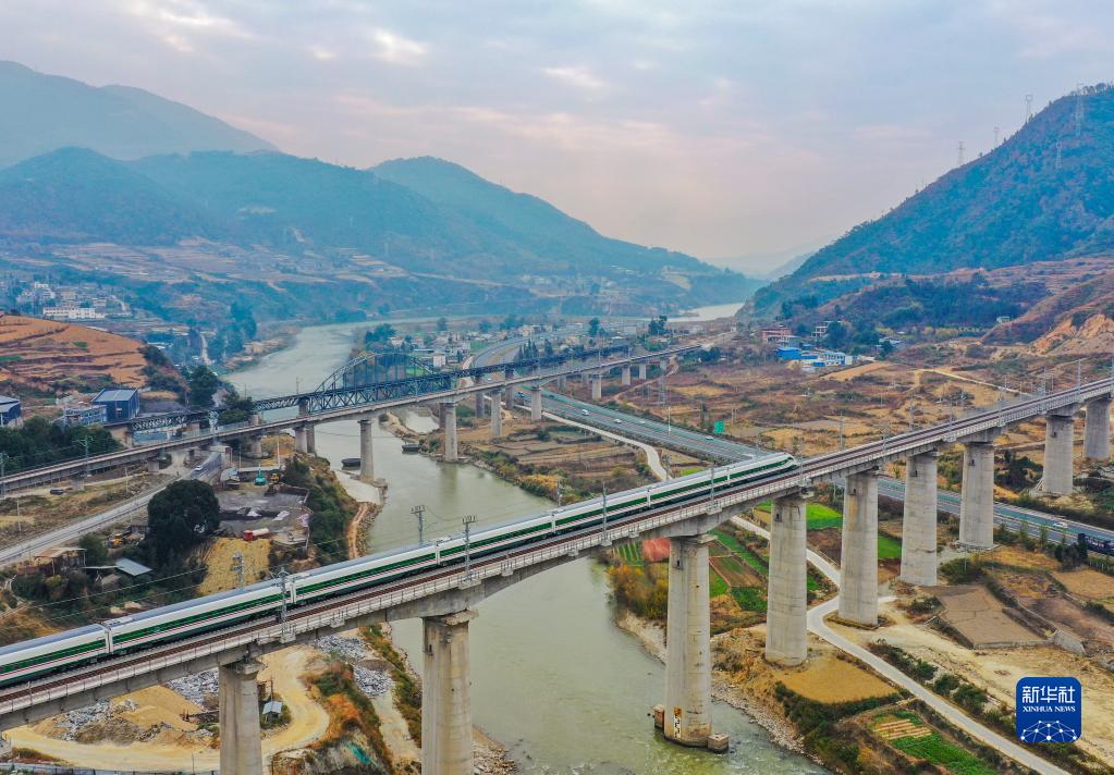 2022年12月26日,蜿蜒千里的新成昆鐵路全線貫通運(yùn)營。復(fù)興號動車組從成都南站發(fā)出,沿著現(xiàn)代化的鐵路,奔馳在崇山峻嶺間。