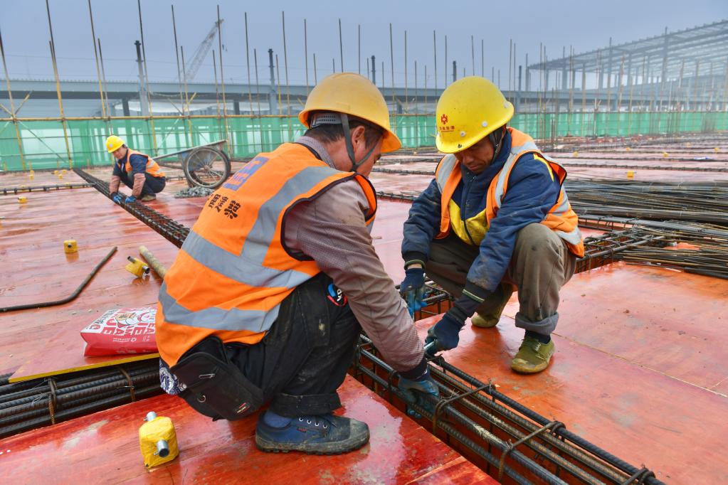 連接江蘇蘇州、泰州和南通的張靖皋長江大橋南航道橋施工現(xiàn)場(1月13日攝)。新華社記者季春鵬 攝