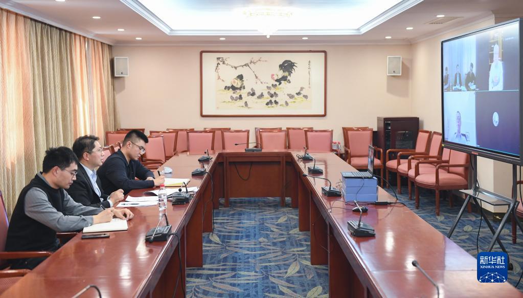 3月8日,科技部成果轉化與區(qū)域創(chuàng)新司二級巡視員陳宏生(左二)和他的兩位同事在科技部與全國政協(xié)委員隆克平等視頻連線。新華社記者 戴天放 攝