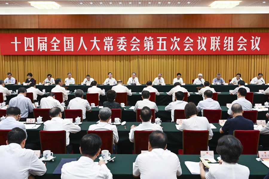 8月30日上午,十四屆全國人大常委會第五次會議在北京人民大會堂舉行聯(lián)組會議,審議國務(wù)院關(guān)于確保國家糧食安全工作情況的報告并開展專題詢問。趙樂際委員長主持并講話。新華社記者 張領(lǐng) 攝