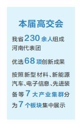 本屆高交會(huì)以“激發(fā)創(chuàng)新活力 提升發(fā)展質(zhì)量”為主題,是史上規(guī)模最大、參與國(guó)家和地區(qū)最多的一屆高交會(huì)。作為高交會(huì)的“老朋友”,省商務(wù)廳組織230余人組成河南代表團(tuán),在全省優(yōu)選了68項(xiàng)創(chuàng)新成果,按照新型材料、新能源汽車(chē)、電子信息、先進(jìn)裝備、現(xiàn)代食品、現(xiàn)代輕紡、現(xiàn)代醫(yī)藥等7大產(chǎn)業(yè)集群分為7個(gè)板塊集中展示,并攜旭陽(yáng)光電、超聚變、力量鉆石、綠纖股份、未來(lái)星機(jī)器人等16家企業(yè)亮相。