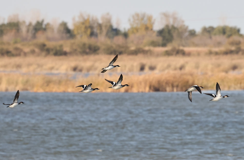 2023年11月12日,在黃河三角洲國家級自然保護(hù)區(qū),越冬候鳥在飛翔。新華社記者 徐速繪 攝