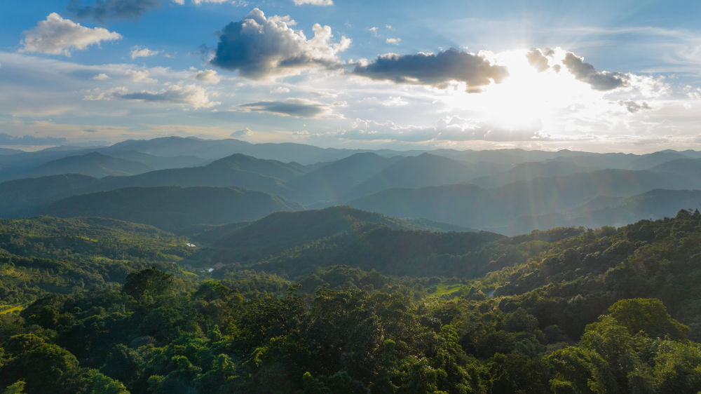 這是2023年9月16日拍攝的日落時分的云南普洱景邁山風(fēng)光(無人機照片)。新華社記者 胡超 攝