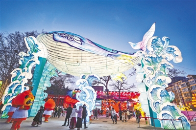 ??經(jīng)過快捷有序安檢,游客魚貫而入。這里不僅有金黃銀杏葉組成的“姓氏起源”樹,還有巨大鯨魚與藍(lán)色波浪融為一體的“海晏河清”燈組。記者從現(xiàn)場了解到,“鯨魚”正下方就是主會場,不定時會有各種節(jié)目表演來充當(dāng)氛圍組。不一會兒,憨態(tài)可掬的“祝融熊貓”、悠揚動聽的民族樂器、精彩絕倫的“木偶變臉”就在這兒輪番上演,引得圍觀人群歡呼連連。