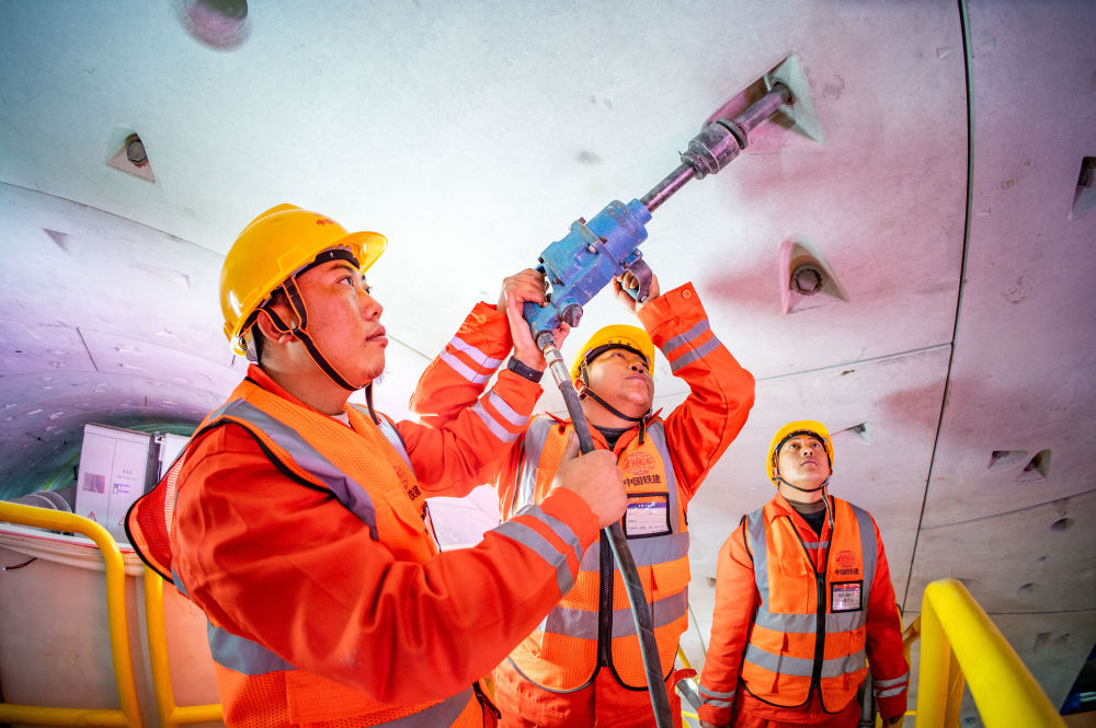 ??在中鐵十四局京唐城際鐵路運(yùn)潮減河隧道內(nèi),施工人員在拼裝管片(2024年2月4日攝)。新華社發(fā)(中鐵十四局供圖)
