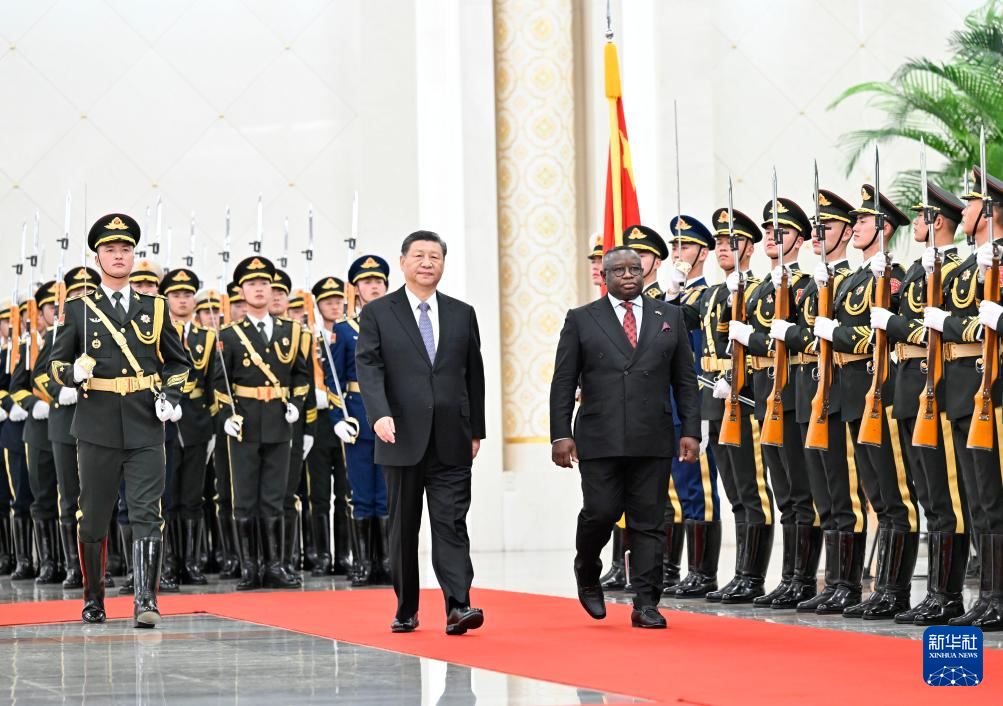 ??會談前,習(xí)近平和夫人彭麗媛在人民大會堂北大廳為比奧和夫人法蒂瑪舉行歡迎儀式。