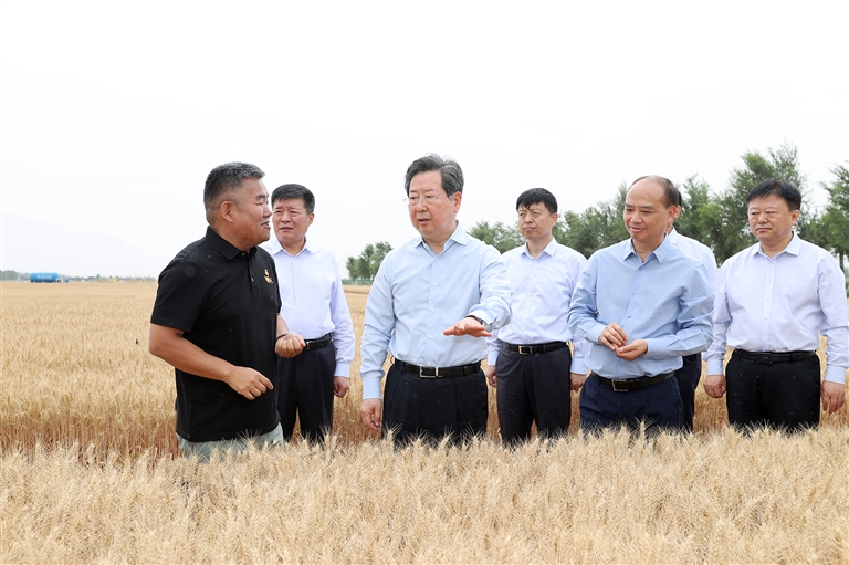 長(zhǎng)葛市石象鎮(zhèn)的高標(biāo)準(zhǔn)農(nóng)田里,金色的麥浪起伏蕩漾,聯(lián)合收割機(jī)穿梭奔忙,一派燦爛豐盈的喜人景象。樓陽生走進(jìn)麥田、揉開麥穗,察看麥粒飽滿程度,與農(nóng)戶、農(nóng)機(jī)手親切交流,了解播種面積、麥?zhǔn)者M(jìn)度、收成收入等。他指出,春爭(zhēng)日、夏爭(zhēng)時(shí),要密切關(guān)注天氣變化,搶抓麥?zhǔn)沼欣翱谄?,加?qiáng)跨區(qū)機(jī)收組織調(diào)度,提升機(jī)械化、智能化水平,確保應(yīng)收盡收、顆粒歸倉。在河南鼎優(yōu)農(nóng)業(yè)科技有限公司,樓陽生走進(jìn)新品種展示中心,了解玉米、瓜果、蔬菜等新品種培育種植情況,鼓勵(lì)企業(yè)不僅要培優(yōu)種好新品種,還要往深加工走,拉長(zhǎng)產(chǎn)業(yè)鏈、提高附加值。在聽取企業(yè)人才引育情況匯報(bào)后,他指出,發(fā)展現(xiàn)代農(nóng)業(yè)離不開一支高素質(zhì)農(nóng)業(yè)從業(yè)者隊(duì)伍,要加強(qiáng)產(chǎn)業(yè)扶持、政策支持,培育引導(dǎo)更多愛農(nóng)業(yè)、有知識(shí)、懂技術(shù)、善經(jīng)營(yíng)的新農(nóng)人,投身農(nóng)村廣闊天地大展身手。