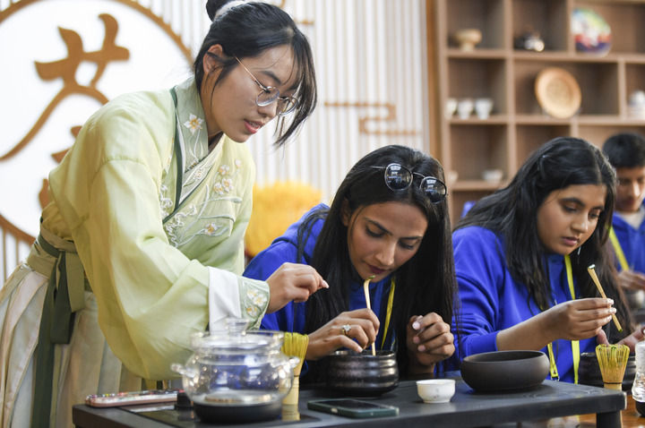 ??2024年4月15日,參加2024年“漢語(yǔ)橋”上合組織國(guó)家青年學(xué)生春令營(yíng)的來(lái)華青年學(xué)生在新疆師范大學(xué)學(xué)生(左)的指導(dǎo)下學(xué)習(xí)茶藝。新華社記者 王菲 攝