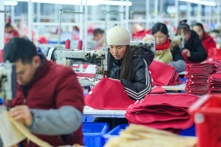 ??2024年1月18日,社區(qū)居民在紅安社區(qū)的鄉(xiāng)村振興就業(yè)車間工作。紅安社區(qū)是由易地搬遷安置區(qū)單獨(dú)成立的新社區(qū),位于湖南省湘西土家族苗族自治州鳳凰縣禾庫(kù)鎮(zhèn)。新華社記者 張鋮 攝