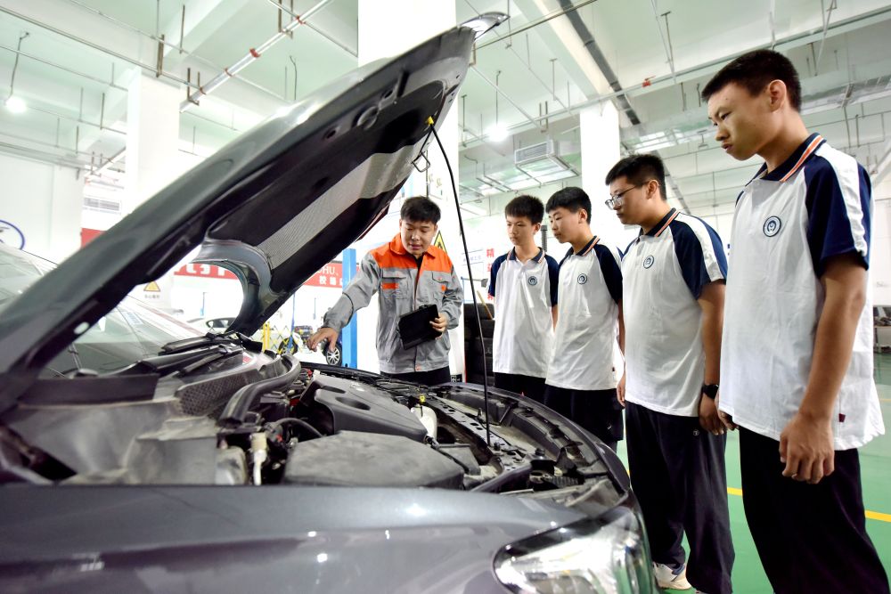 ??2024年6月7日,河北省邢臺市威縣職業(yè)技術教育中心教師在指導學生學習汽車維修技術。新華社記者 王曉 攝
