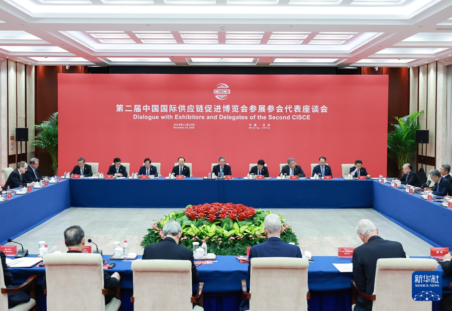 ??11月25日,國(guó)務(wù)院總理李強(qiáng)在北京同第二屆中國(guó)國(guó)際供應(yīng)鏈促進(jìn)博覽會(huì)參展參會(huì)企業(yè)代表座談。新華社記者 王曄 攝
