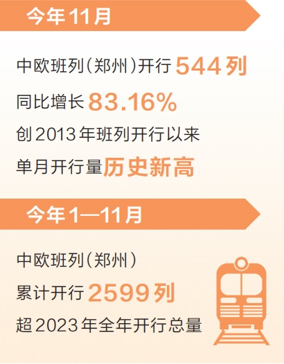 12月2日,記者獲悉,今年11月,中豫港務集團鄭州陸港公司開行中歐班列(鄭州)544列,同比增長83.16%,創(chuàng)2013年班列開行以來單月開行量歷史新高。中歐班列(鄭州)今年1—11月累計開行2599列,超2023年全年開行總量。